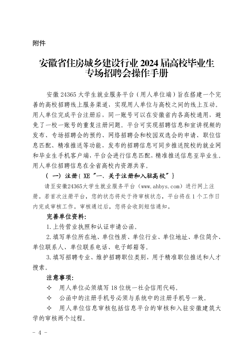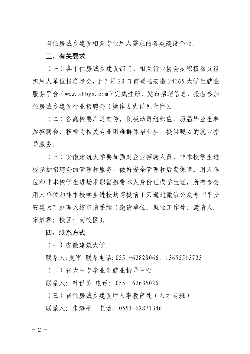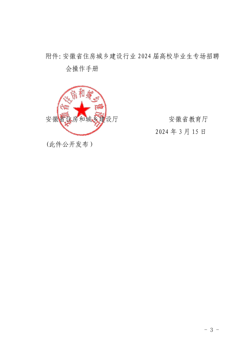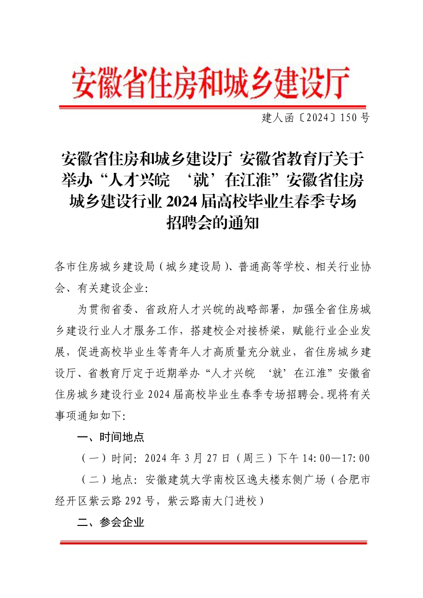 现将“安徽省住房和城乡建设厅 安徽省教育厅关于举办‘人才兴皖‘就’在江淮’安徽省住房城乡建设行业2024届高校毕业生春节专场招聘会的通知”(建人函【2024】150号文)转发给你们,请各单位参照文件要求,结合实际,积极参与。