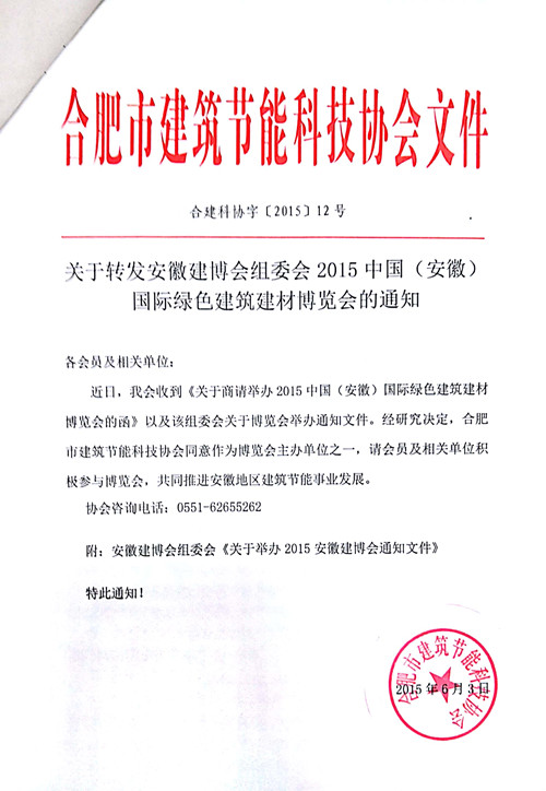 关于转发安徽建博会组委会2015中国(安徽)国际绿色建筑建材博览会的通知