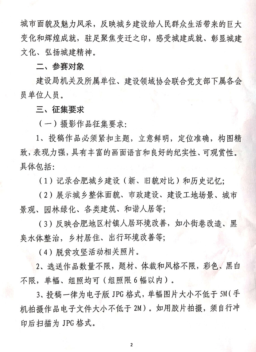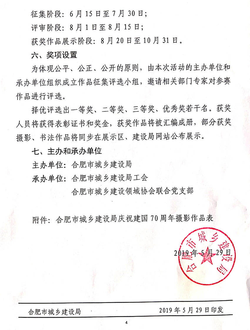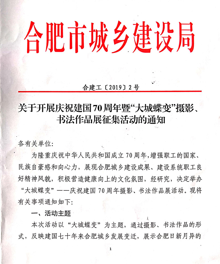 现将合肥市城乡建设局《关于开展庆祝建国70周年暨“大城蝶变”摄影、书法作品展征集活动的通知》(合建工﹝2019﹞2号)转发给你们,请各会员单位认真阅读,踊跃报名。