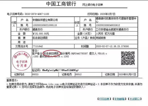 安徽皖邦塑业向撮镇镇村捐款20000元整,用于抗击新冠疫情